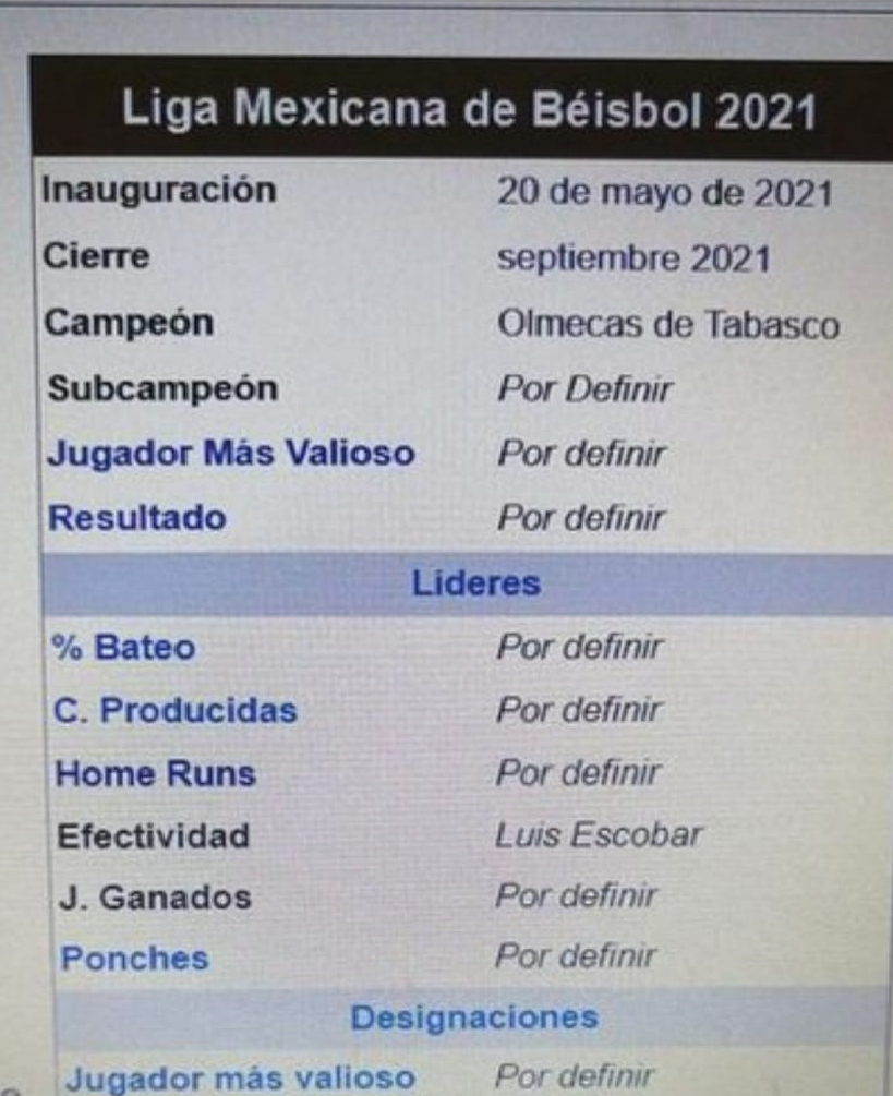 Villahermosa, Tabasco, martes 03 de agosto de 2021, Poderycrítica.- Como si se tratara de una predicción, un dejavu o algo relacionado con Volver al Futuro, la página de Wikipedia puso a los Olmecas de Tabasco como campeones de la actual temporada de béisbol de la Liga Mexicana.