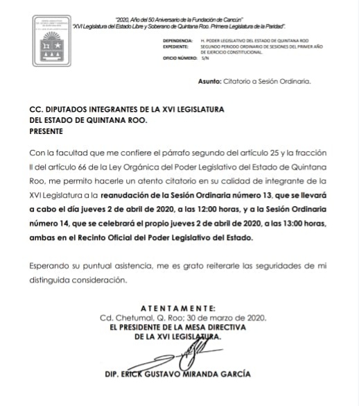 Chetumal, Q. Roo, Martes 31 de marzo de 2020, poderycrítica.- El presidente de la Mesa Directiva del Congreso del Estado, Erick Gustavo Miranda García, convocó a la reanudación de la sesión ordinaria número 13 que fue suspendida el pasado 18 de marzo, ante la polémica generada por la lectura de la correspondencia que notificó del ascenso del diputado Alberto Batún Chulim como coordinador de la bancada de Morena y presidente de la Junta de Gobierno y Coordinación Política (Jugocopo).