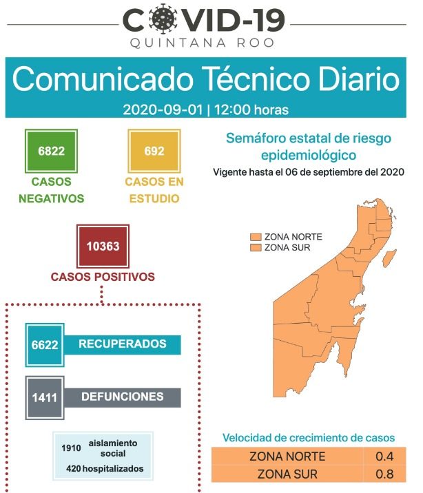 Cancún, Q. Roo, Martes 01 de Septiembre de 2020, poderycrítica.- Quintana Roo continúa sumando casos positivos y defunciones a raíz de la contingencia epidemiológica que representa el coronavirus, tan sólo en las últimas 24 horas sumaron 11 muertes y 51 casos positivos.