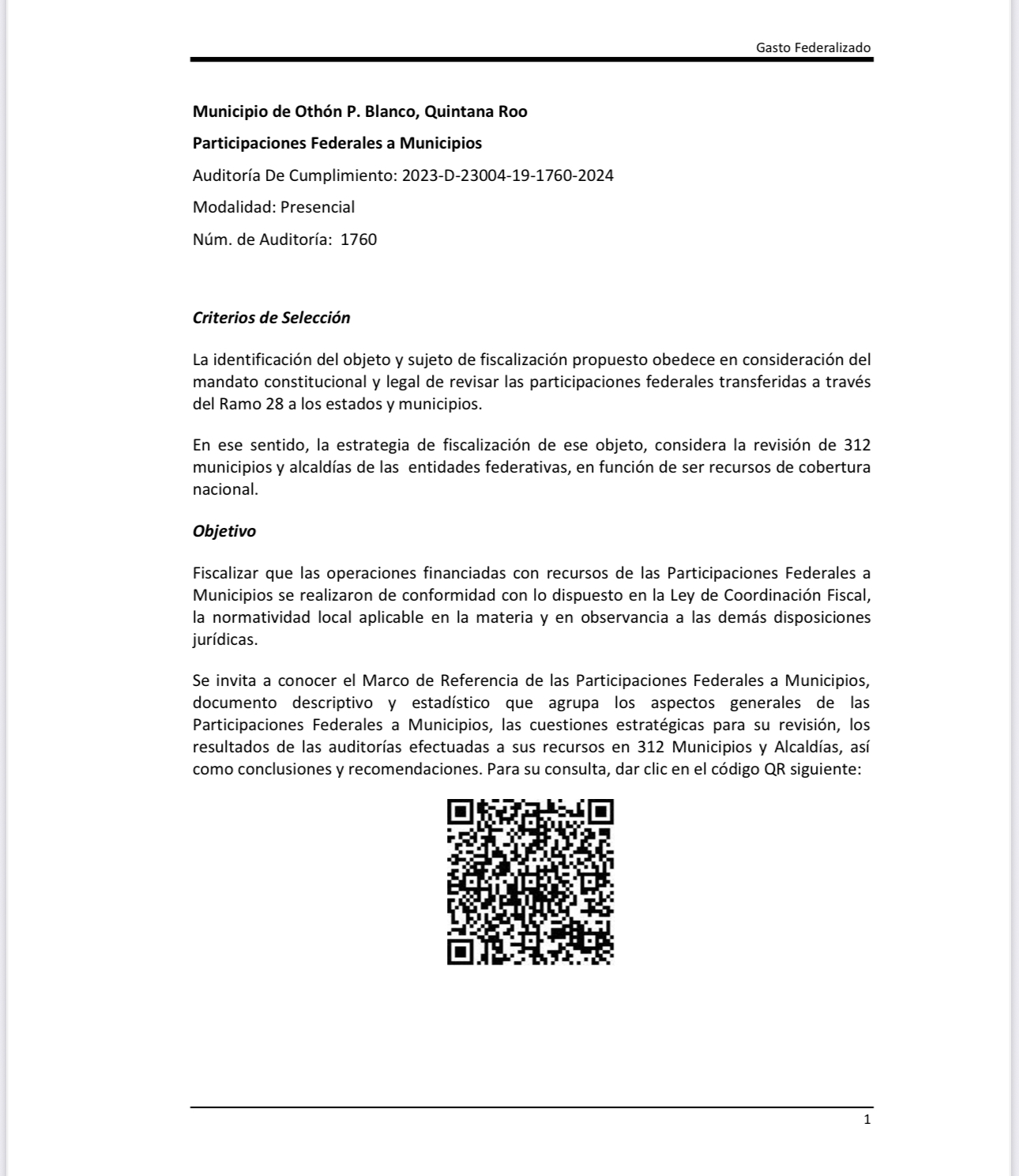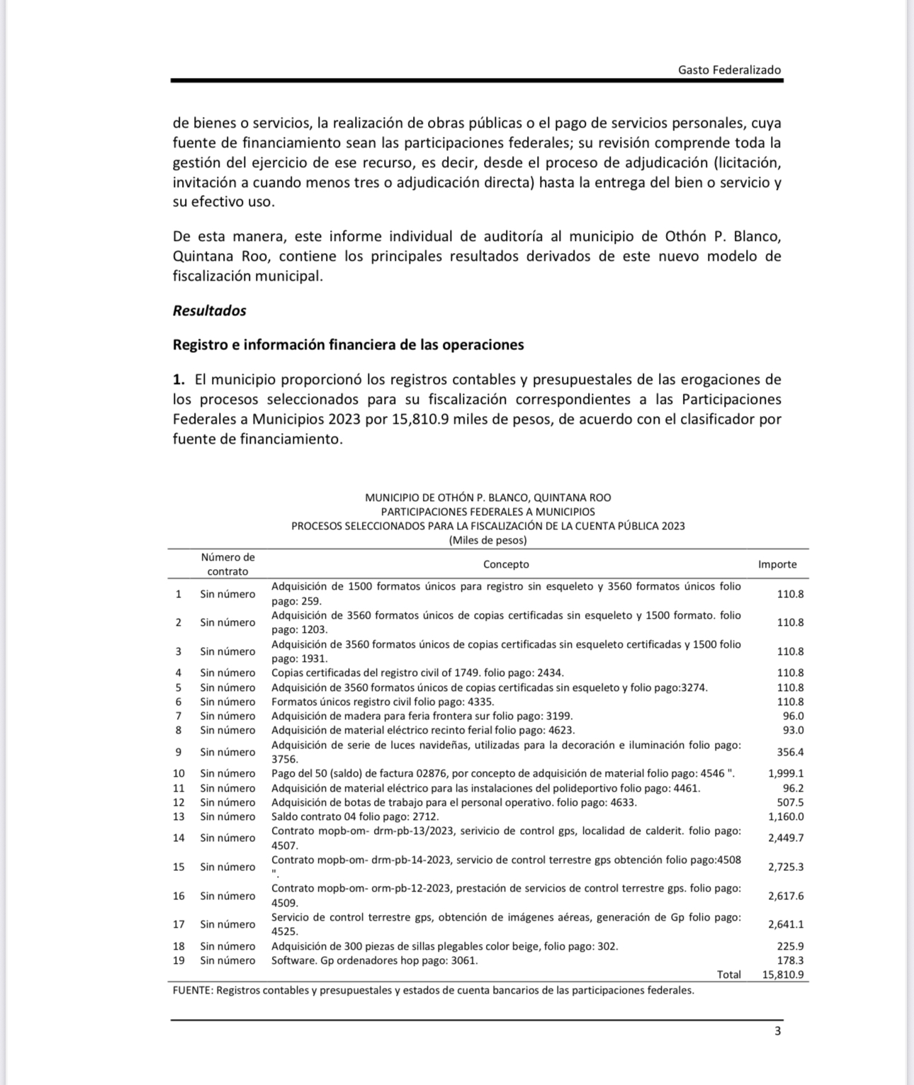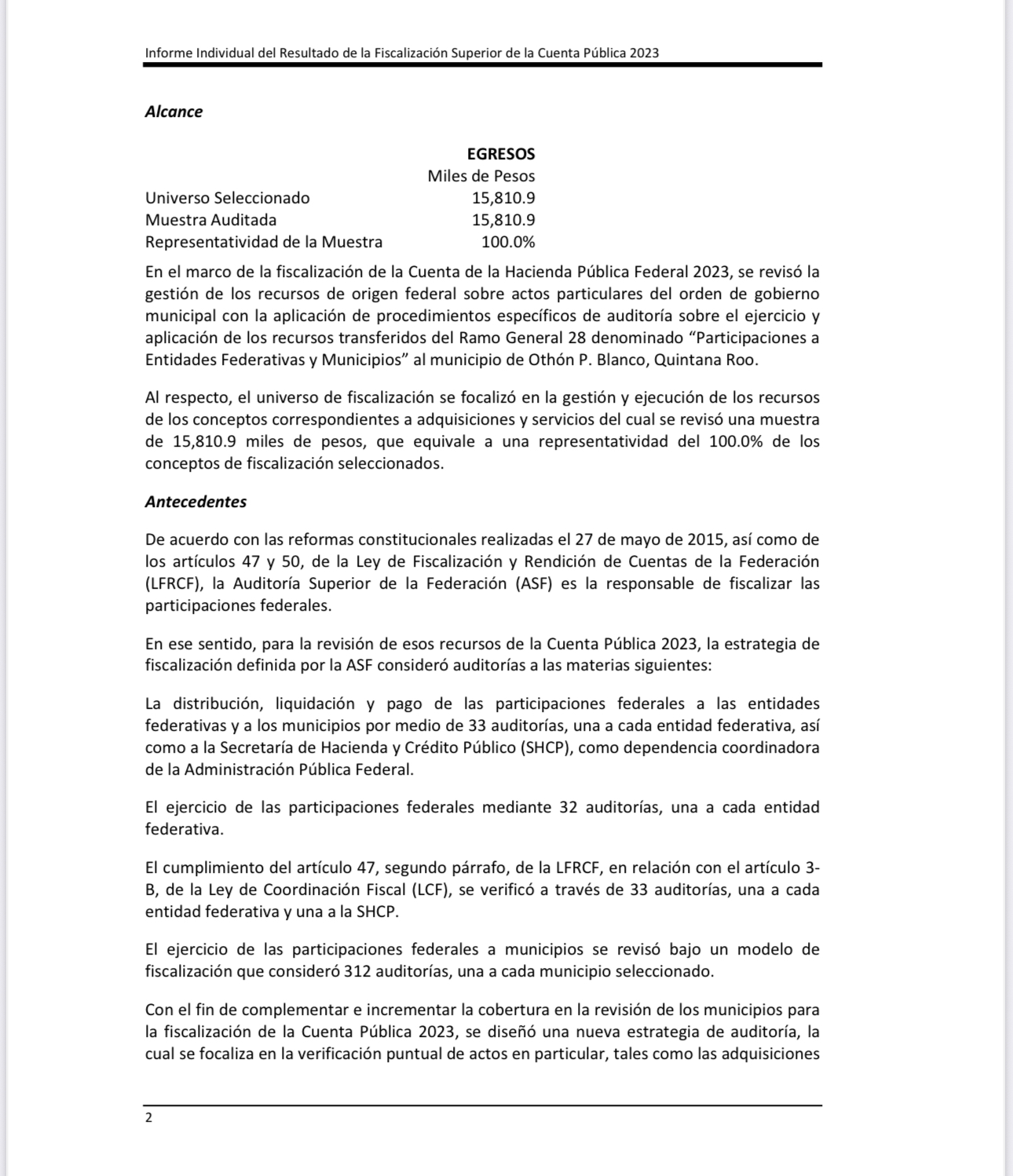 15 millones 810 mil pesos con 90 centavos, con la aplicación de procedimientos específicos de auditoría sobre el ejercicio y aplicación de los recursos transferidos del Ramo General 28 denominado “Participaciones a Entidades Federativas y Municipios” al municipio de Othón P. Blanco, Quintana Roo.