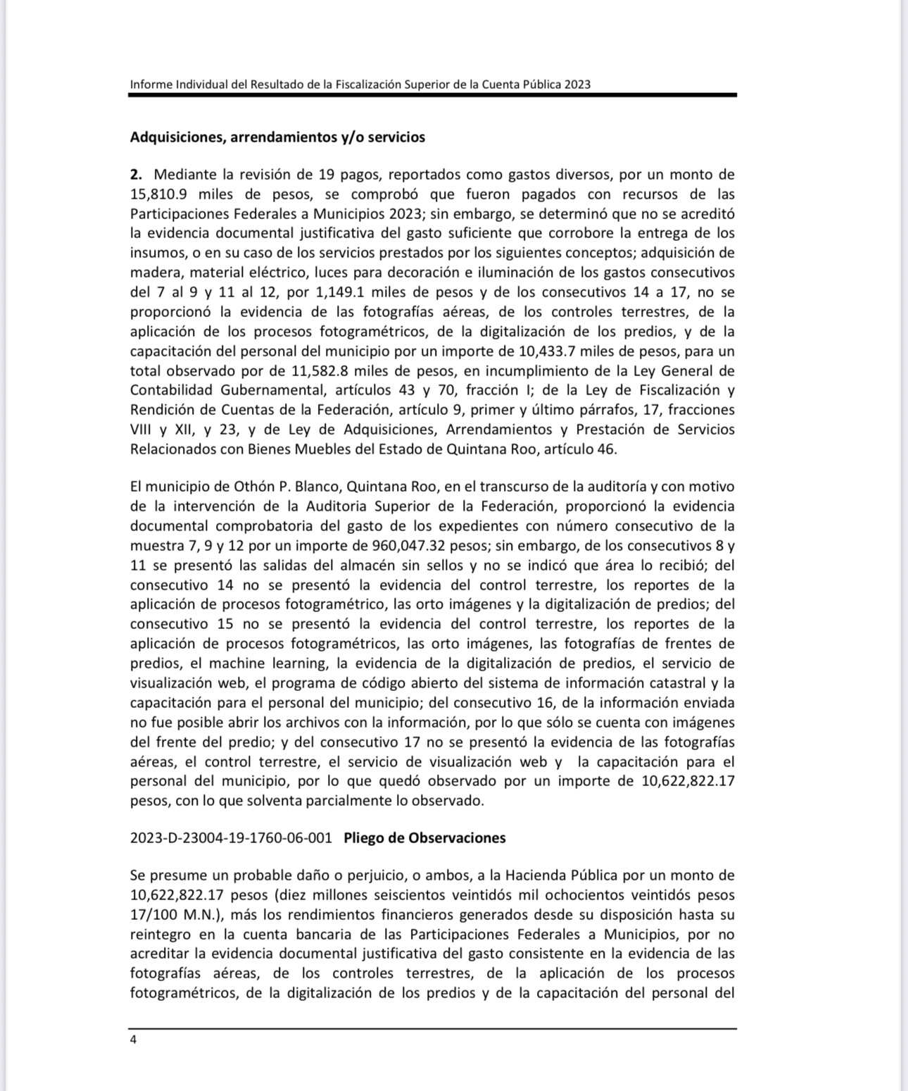 La ASF señala que “Del 2023-D-23004-19-1760-06-001 Pliego de Observaciones, se presume un probable daño o perjuicio, o ambos, a la Hacienda Pública por un monto de 10,622,822.17 pesos (diez millones seiscientos veintidós mil ochocientos veintidós pesos 17/100 M.N.), más los rendimientos financieros generados desde su disposición hasta su reintegro en la cuenta bancaria de las Participaciones Federales a Municipios, por no acreditar la evidencia documental justificativa del gasto consistente en la evidencia de las fotografías aéreas, de los controles terrestres, de la aplicación de los procesos fotogramétricos, de la digitalización de los predios y de la capacitación del personal…