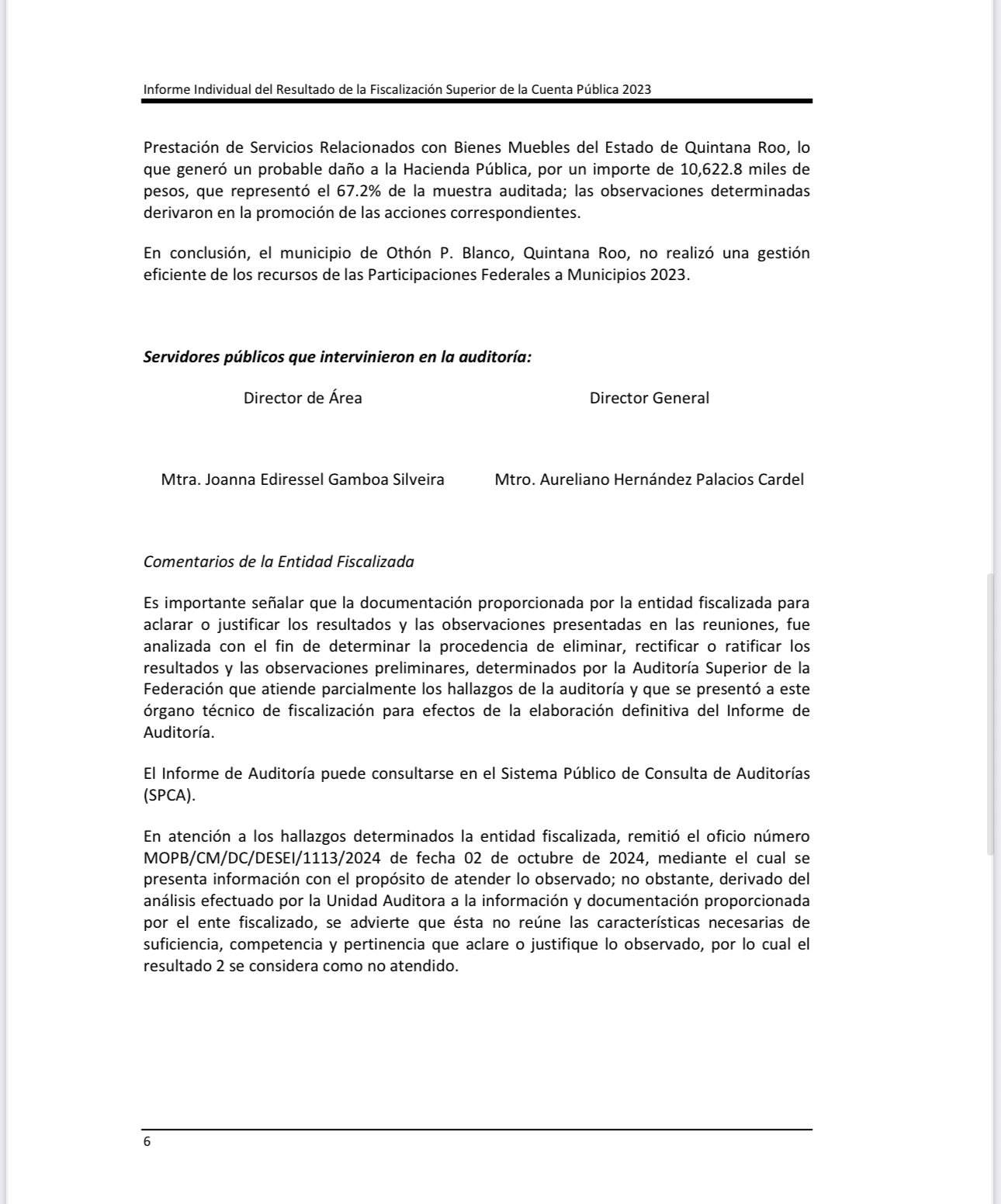 La ASF dice: “ En conclusión, el municipio de Othón P. Blanco, Quintana Roo, no realizó una gestión eficiente de los recursos de las Participaciones Federales a Municipios 2023. Es importante señalar que la documentación proporcionada por la entidad fiscalizada para aclarar o justificar los resultados y las observaciones presentadas en las reuniones, fue analizada con el fin de determinar la procedencia de eliminar, rectificar o ratificar los resultados y las observaciones preliminares, determinados por la Auditoría Superior de la Federación que atiende parcialmente los hallazgos de la auditoría y que se presentó a este órgano técnico de fiscalización para efectos de la elaboración definitiva del Informe de Auditoría.