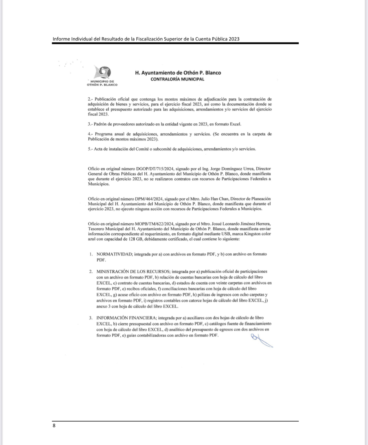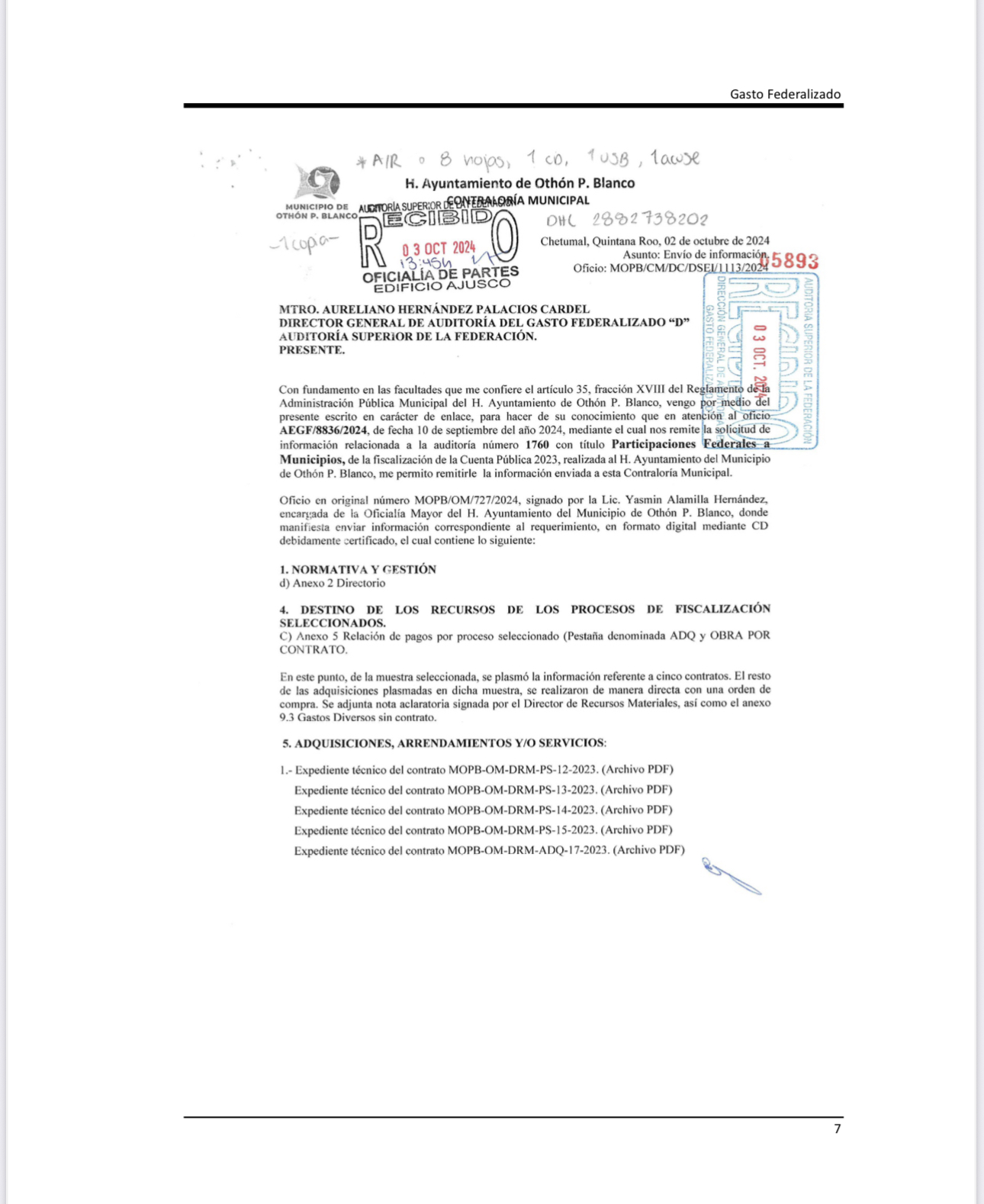 Agrega que “el municipio de Othón P. Blanco, Quintana Roo, en el transcurso de la auditoría y con motivo de la intervención de la Auditoria Superior de la Federación, proporcionó la evidencia documental comprobatoria del gasto de los expedientes con número consecutivo de la muestra 7, 9 y 12 por un importe de 960,047.32 pesos; sin embargo, de los consecutivos 8 y 1 se presentó las salidas del almacén sin sellos y no se indicó que área lo recibió”