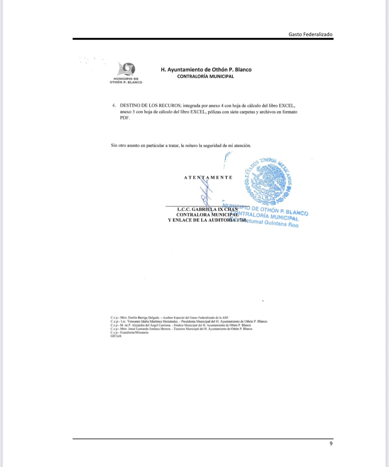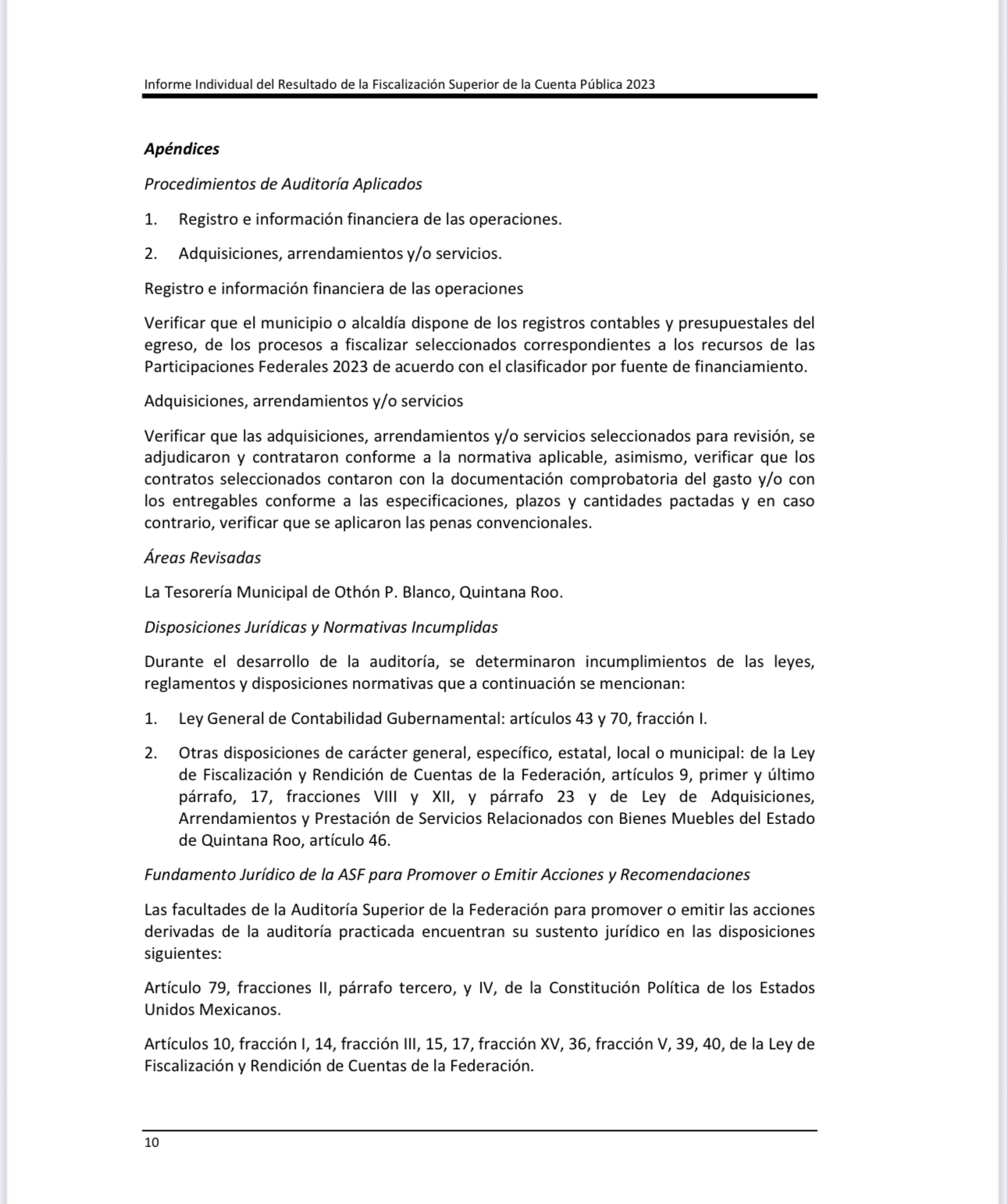 “La administración de Yensunni Martínez en materia del Gasto Federalizado el municipio, incumplió la Ley General de Contabilidad Gubernamental, artículos 43 y 70, fracción I, y de la Ley de Fiscalización y Rendición de Cuentas de la Federación, artículos 9, primer y último párrafos, 17, fracciones VIII y XII, y párrafo 23, y de la Ley de Adquisiciones, Arrendamientos y Prestación de Servicios Relacionados con Bienes Muebles del Estado de Quintana Roo, artículo 46”.