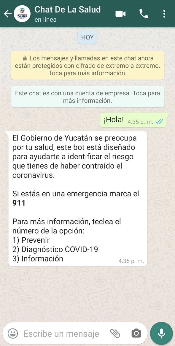El chat de la salud de WhatsApp es tecnología yucateca, diseñada aquí y de fácil uso para complementar los esfuerzos ya realizados, como la línea 800 YUCATÁN (800 982 2826) y la página coronavirus.yucatan.gob.mx. sitio en el que está toda la información generada por el Gobierno del Estado de Yucatán hasta el momento sobre esta contingencia; ahí se encuentran los anuncios realizados por el gobernador Mauricio Vila Dosal, así como los partes diarios hechos por la Secretaría de Salud estatal.