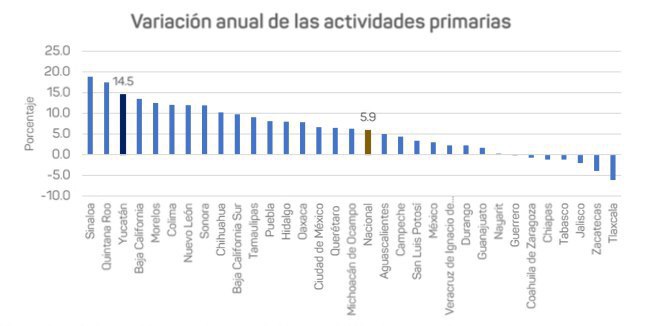 El informe del ITAEE también señala que Yucatán ocupó el tercer lugar nacional en el crecimiento de las actividades de pesca, agricultura, ganadería y, en general, de las actividades relacionadas con el campo, con 14.5 puntos porcentuales, más del doble del 5.9% de promedio nacional. Sólo fue superado por Sinaloa y Quintana Roo, que estuvieron arriba de los 15 puntos porcentuales.