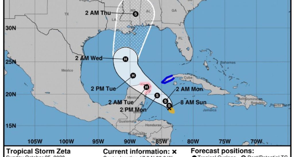 México, 26 octubre; poderycrítica.-La tormenta tropical Zeta azotará este lunes con fuerza de huracán al extremo de la península mexicana de Yucatán, el martes entrará al Golfo de México y el miércoles estará cerca de la costa sur de Estados Unidos, según el Centro Nacional de Huracanes (NHC) de este último país.