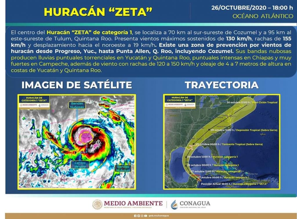 Chetumal, Q. Roo, Lunes 26 de Octubre del 2020, poderycrítica.- El huracán Zeta se mantiene en Categoría 1, informó la Comisión Nacional del Agua (CONAGUA).