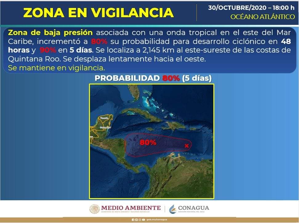Chetumal, Q. Roo, Viernes 30 de Octubre del 2020, poderycrítica.- Autoridades estatales de Protección Civil informaron que se mantienen en vigilancia de una zona de baja presión con 80 por ciento a 48 horas de pasar a ciclón tropical.