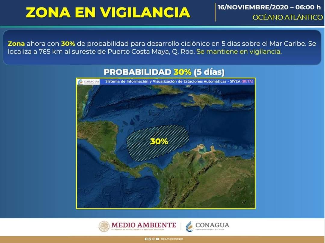 Chetumal, Q. Roo, Lunes 16 de Noviembre del 2020, poderycrítica.- La Coordinación Estatal de Protección Civil informó que hay una zona de baja presión con 30% de probabilidad para desarrollo ciclónico en 5 días sobre el Mar Caribe. Se localiza a 765 kilómetros de Puerto Costa Maya.