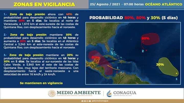 Chetumal, Quintana Roo, miércoles 25 de agosto del 2021, poderycritica.- Incrementa a 80% en cinco días zona de baja presión del mar Caribe su probabilidad de evolucionar en un sistema ciclónico, se ubica a 1,610 kilómetros de las costas de Quintana Roo.