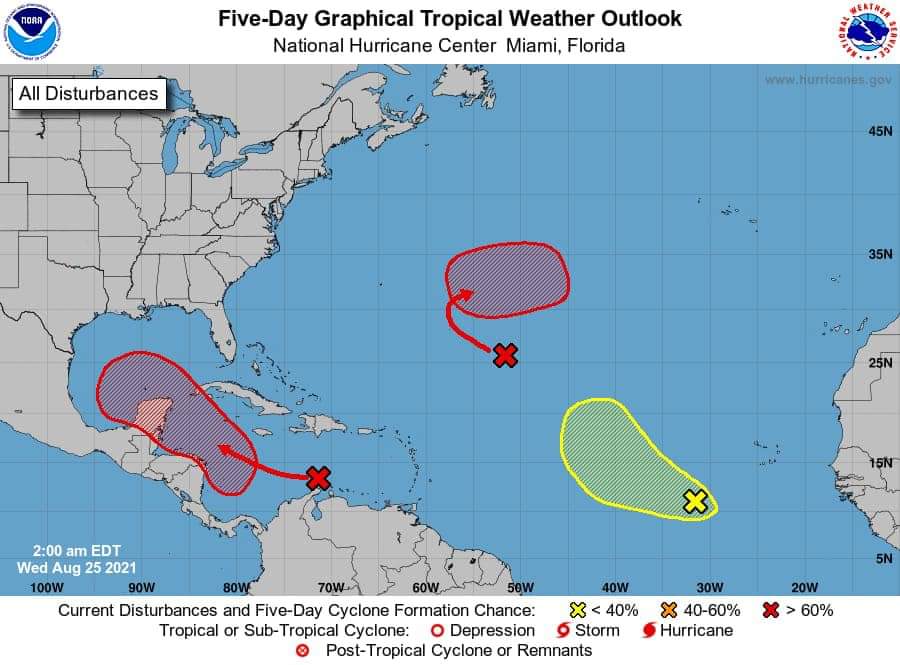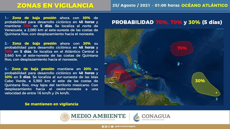 Chetumal, Quintana Roo, miércoles 25 de agosto del 2021, poderycritica.- La zona de baja presión del mar Caribe se ubicaba al este sureste aproximadamente a 2,080 kilómetros de las costas de Quintana Roo durante la madrugada de este miércoles, mantiene una probabilidad de 30% a 48 horas y 70% a cinco días de evolucionar en un sistema ciclónico.