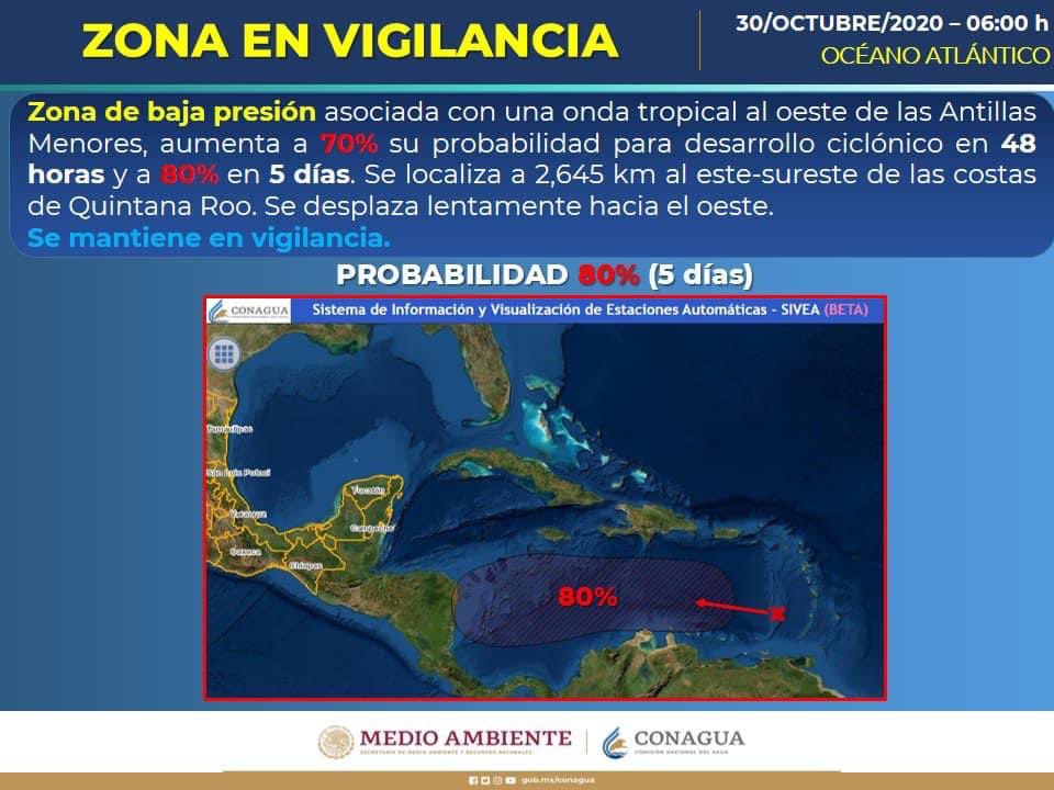 Cancún, Q. Roo, Viernes 30 de Octubre del 2020, poderycritica.- Un sistema de baja presión en el Océano Atlántico aumentó a 70 por ciento su posibilidad de evolucionar a ciclón tropical.