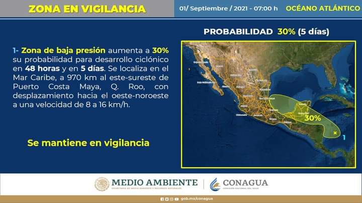 Chetumal, Quintana Roo, miércoles 01 de septiembre del 2021, poderycritica.- Zona de baja presión en el Atlántico aumenta a 30% su probabilidad para desarrollo ciclónico en 48 horas y 5 días. Se localiza en el Mar Caribe a 970 km al este-sureste de Puerto Costa Maya, Quintana Roo.
