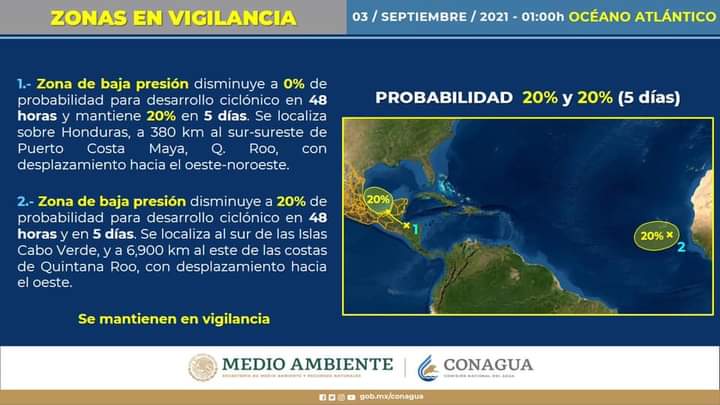 Chetumal, Quintana Roo, viernes 03 de septiembre del 2021, poderycritica.- Con base en el Servicio Meteorológico Nacional, la COEPROC informa que zona de baja presión del mar Caribe, ubicada a 380 kilómetros de las costas de Quintana Roo, mantiene baja probabilidad de evolucionar en un sistema ciclónico, 0% a 48 horas y 2O a cinco días.